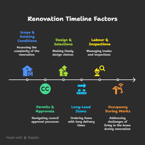 - Top drivers of schedule: scope, permits, selections, long-lead items, inspections, and labour availability.